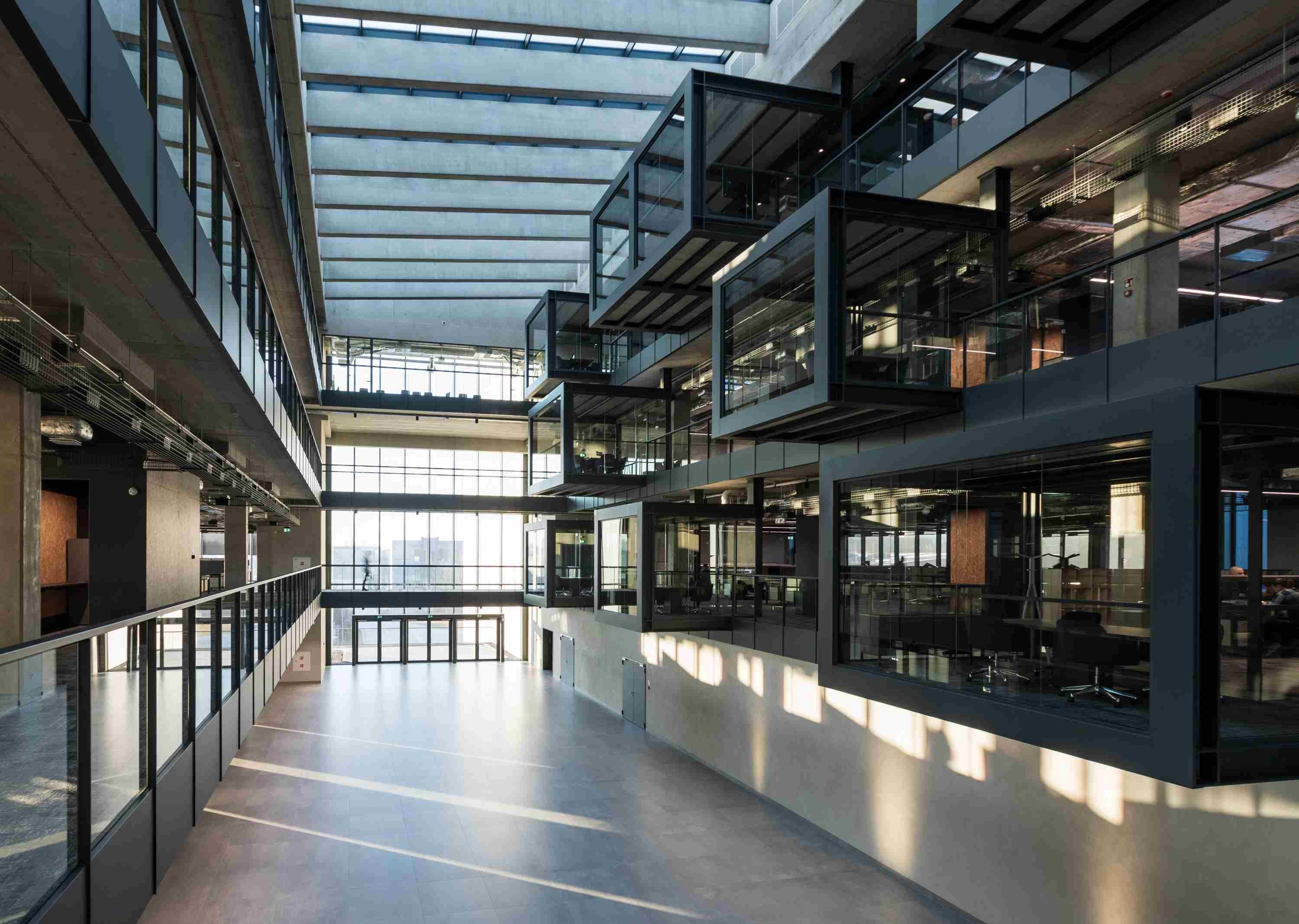Zaraz po wejściu do budynku znajdziemy się w przestronnym patio, a podnosząc wzrok nieco ku górze zobaczymy piętrzące się w powietrzu przeszklone kubiczne sale konferencyjne. Zawieszone w powietrzu pomieszczenia robią wrażenie zarówno na gościach, jak i samych pracownikach. Mają tu oni wszystko, czego potrzeba, by komfortowo zaczynać i kończyć dzień pracy: funkcjonalne miejsca na spotkania, atrakcyjne zaplecza socjalne czy audytorium dla ponad 150 osób. Jest tu również stołówka z własną kuchnią.