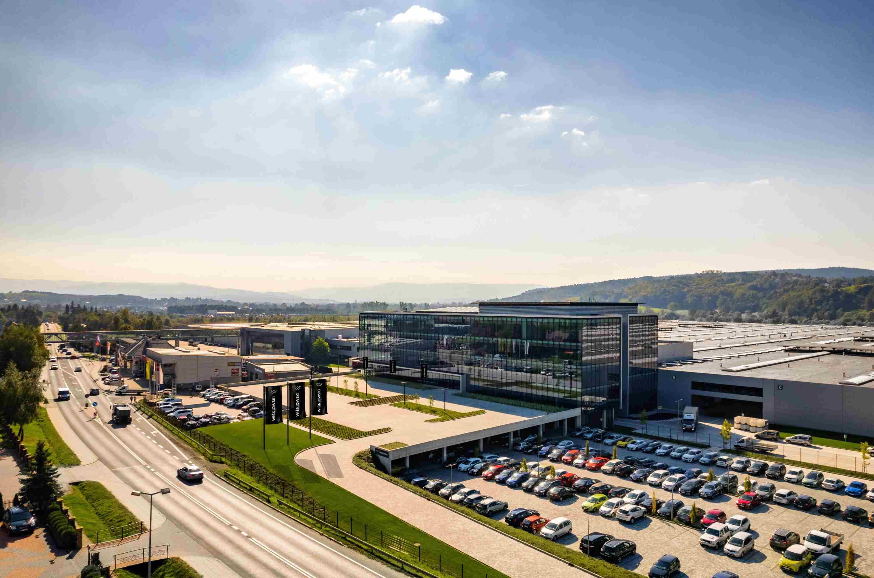 Siedziba firmy WIŚNIOWSKI to pięciokondygnacyjny, w całości przeszklony budynek o długości 100 i szerokości 40 metrów. Całość budynku to dwie bryły o kształcie zbliżonym do prostopadłościanów, ułożonych jeden obok drugiego z delikatnym, wzajemnym przesunięciem, których łącznikiem jest przeszklone atrium. Dynamika kompozycji sugeruje wzajemny ruch, który dodatkowo został wzmocniony przez szklane fasady. Elementem charakterystycznym jest autorski kolor marki WIŚNIOWSKI – HI MODERN GRAPHITE, w odcieniu jedwabno-matowym z delikatną strukturą sandgrain. Autorami projektu architektonicznego są: Konrad Loesch z biura architektonicznego LOESCH+PARTNERS oraz Jarosław Ptak, dyrektor ds. projektów i inwestycji WIŚNIOWSKI.