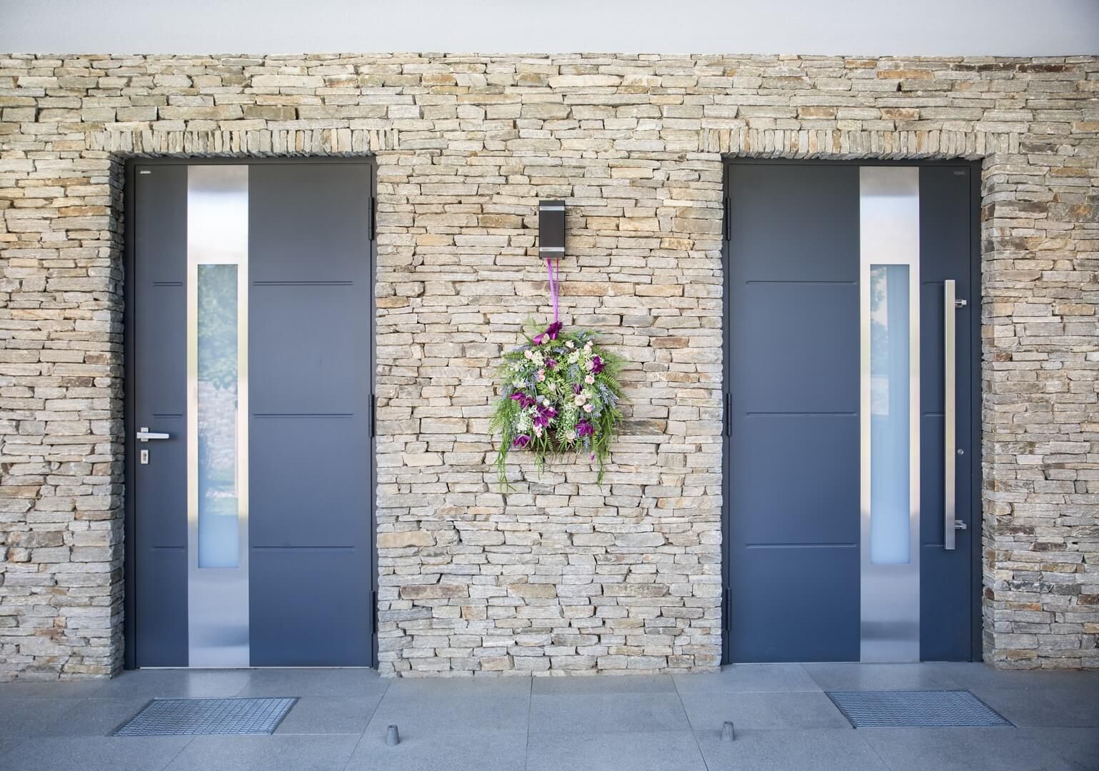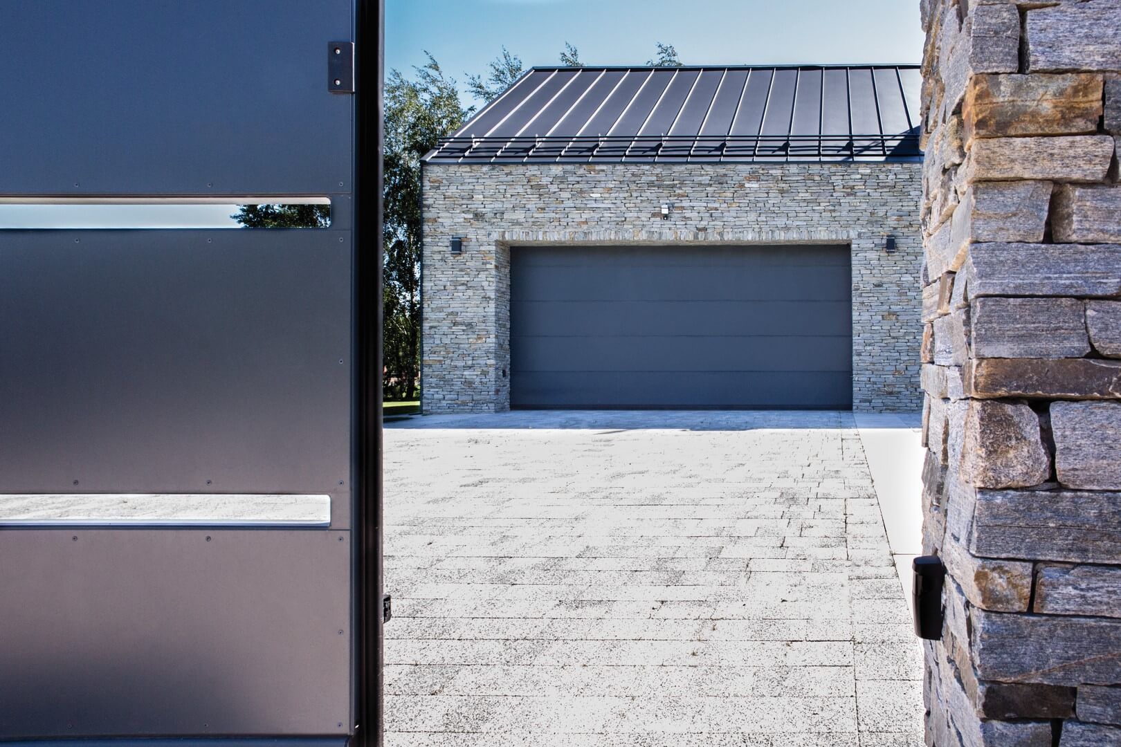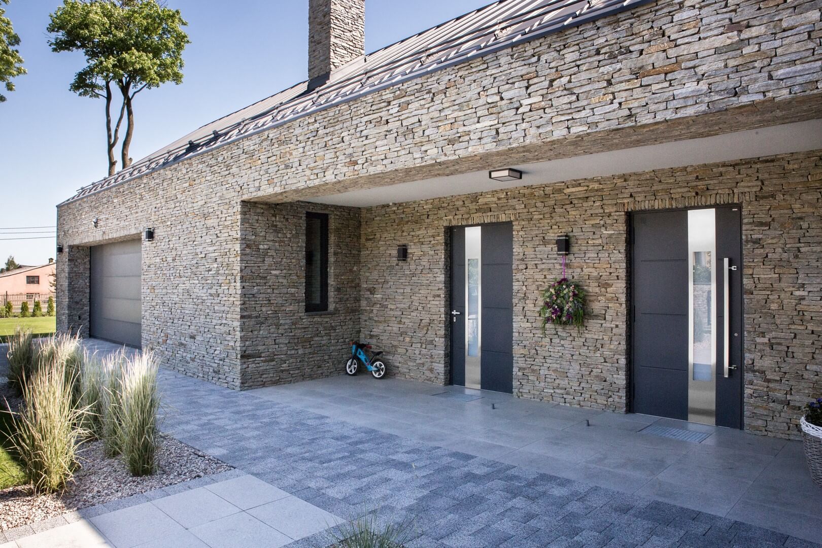 Antracyt doskonale zgrywa się kolorystycznie z surowością kamienia. Mimo że stanowi znaczną część frontu budynku, nie przytłacza i nie wysuwa się na pierwszy plan. Jest to również ciekawe połączenie natury (antracyt to kolor węgla) i nowoczesności (proste linie, minimalizm). Właśnie te ciemniejsze elementy stanowią granice między pierwszą a drugą warstwą. Kluczowa jest w tym przypadku stolarka: drzwi CREO i brama garażowa UniPro. Łączy je nie tylko kolor, ale również eleganckie przetłoczenia, które powtarzają proste linie wyznaczane przez kamienie elewacyjne.