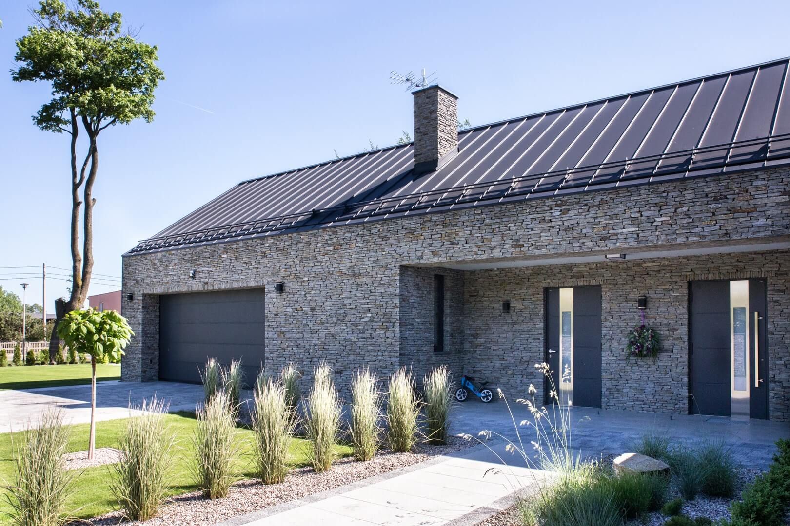 Dom dopasowujemy do otoczenia na aż trzech warstwach. Pierwszą z nich jest fasada i wszystkie jej elementy wraz z dachem. W przypadku tego pięknego domu postawiono na kamień, który pokrywa ściany zewnętrzne i wyróżniające się na tym tle ciemne drzwi, bramę garażową oraz dach.