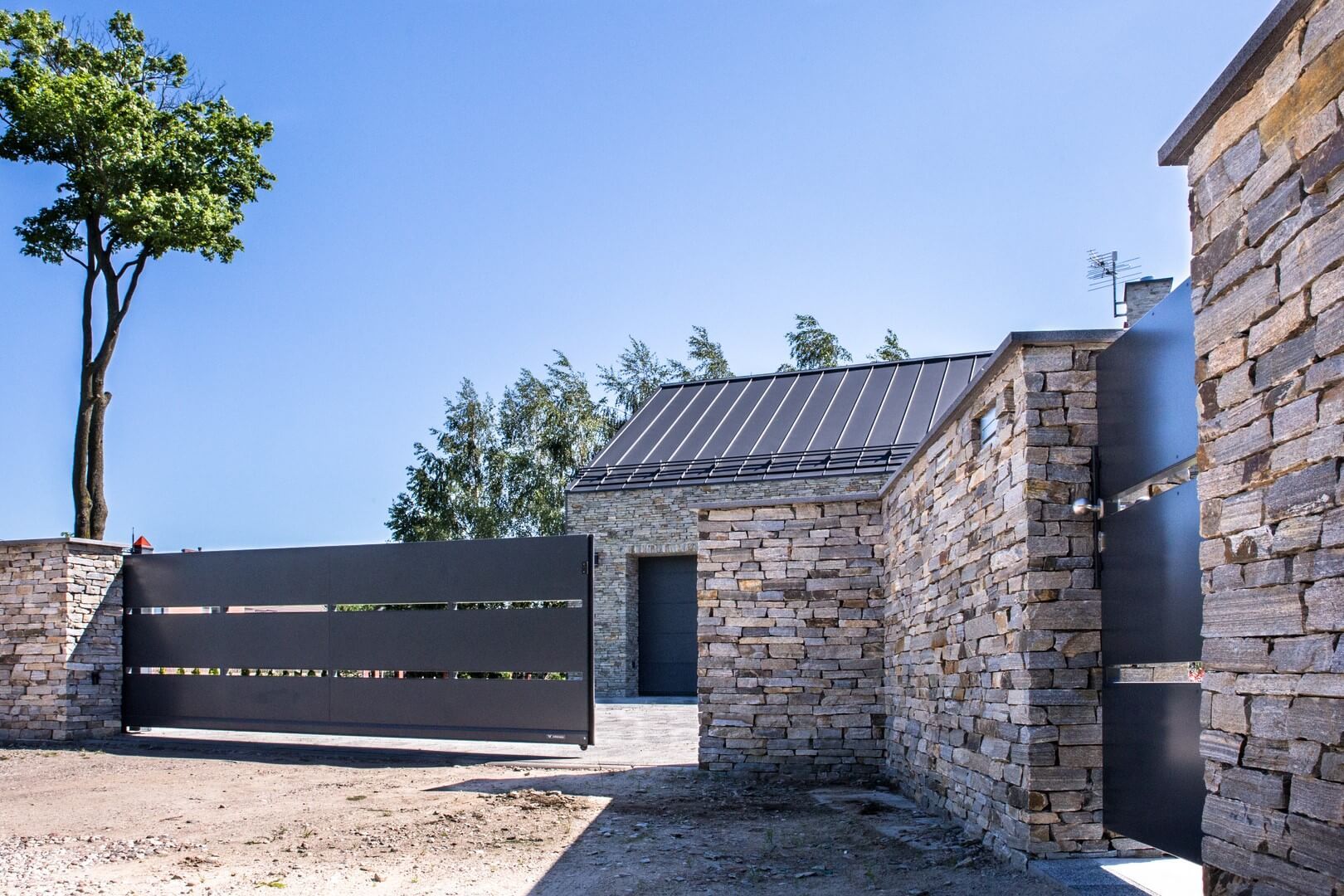 Między domem a otoczeniem stoi posesja. Jej charakter po części powtarza motyw fasady (surowy, szary kamień) i z zachowaniem kolorystycznego balansu (równie surowe trawy i bruk) przechodzi do zieleni trawy. Ta z kolei przenosi nas już dalej – w stronę natury.