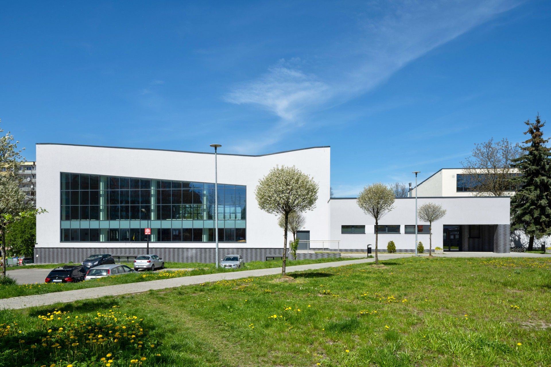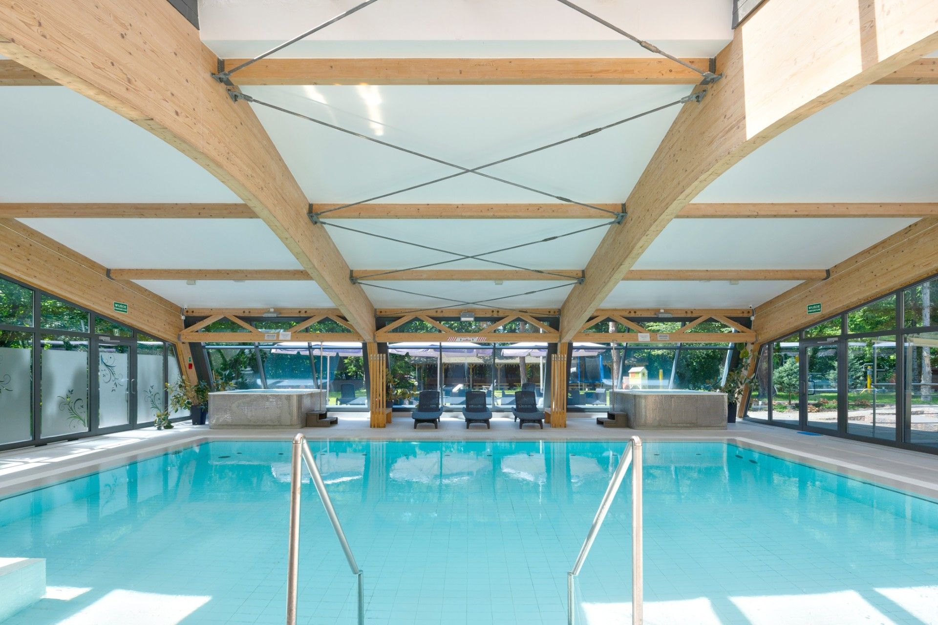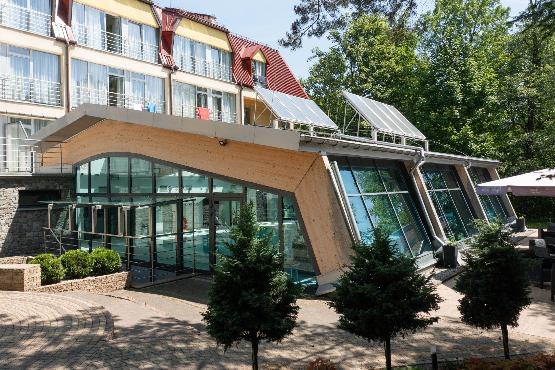 Szklane fasady wykonane w systemie MB-SR50N nadają budynkowi elegancki, nowoczesny charakter i podkreślają otwartość wnętrz — naturalne światło wypełnia przestrzenie, tworząc relaksującą aurę sprzyjającą wypoczynkowi.