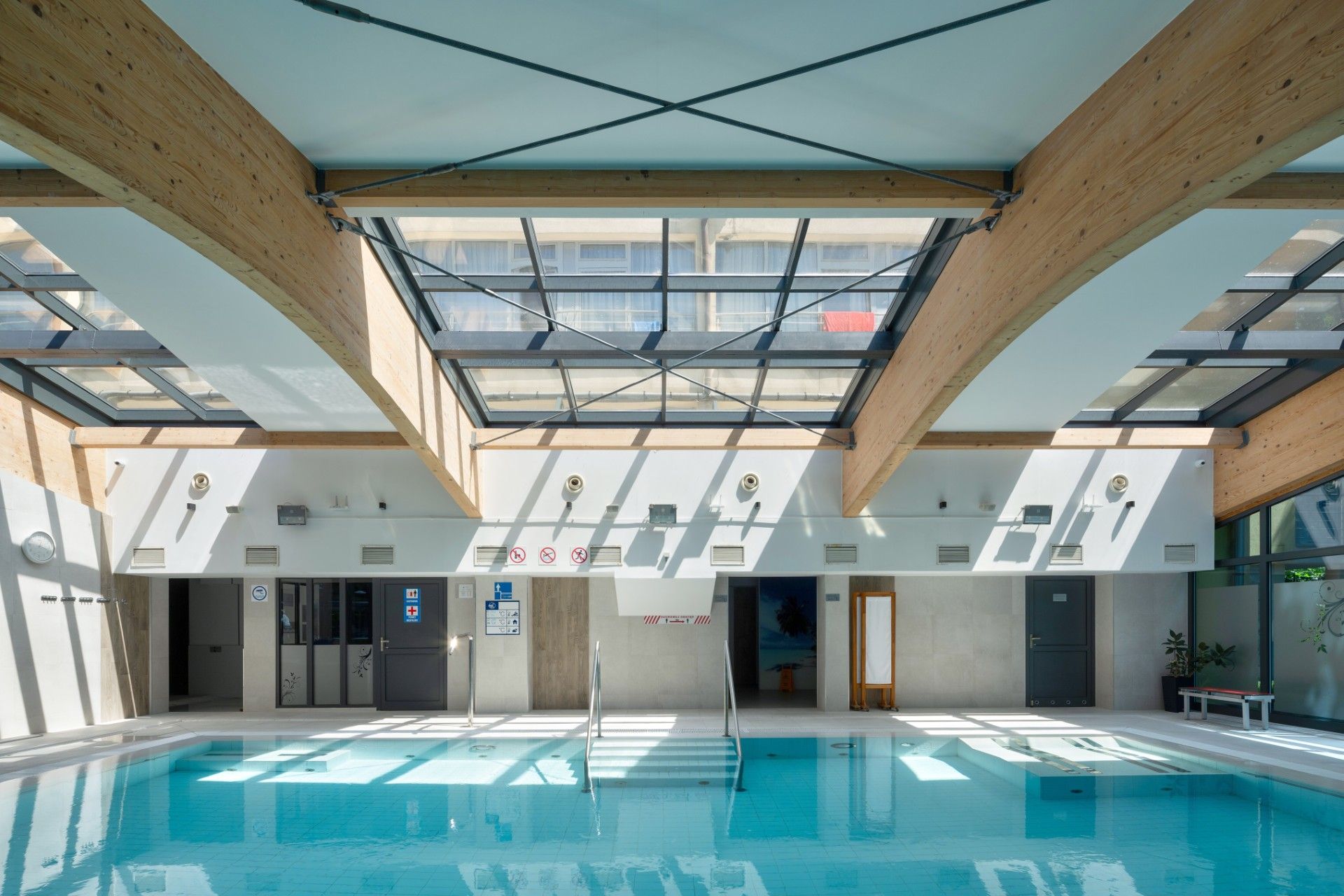 Obiekty publiczne, takie jak pływalnie, muszą sprostać wymaganiom codziennego użytkowania przez setki osób, nie tracąc przy tym na funkcjonalności i estetyce. Siemianowicka pływalnia jest przykładem realizacji, w której trwałość idzie w parze z nowoczesnym, miejskim charakterem architektury. Zastosowane systemy stolarki aluminiowej marki WIŚNIOWSKI doskonale wpisują się w ten kontekst: od strony zewnętrznej wykorzystano system MB70HI. Wewnątrz budynku zastosowano system MB45 – lekki i niezwykle trwały, stworzony z myślą o przestrzeniach o dużym natężeniu ruchu. Oba systemy zapewniają także wysoką szczelność oraz łatwość konserwacji, co w przypadku obiektów basenowych ma szczególne znaczenie ze względu na wilgoć i częsty kontakt z wodą. Aby zapewnić ochronę przed korozją, jaka może wystąpić w ekstremalnych warunkach środowiskowych, wykonano lakierowanie C4.