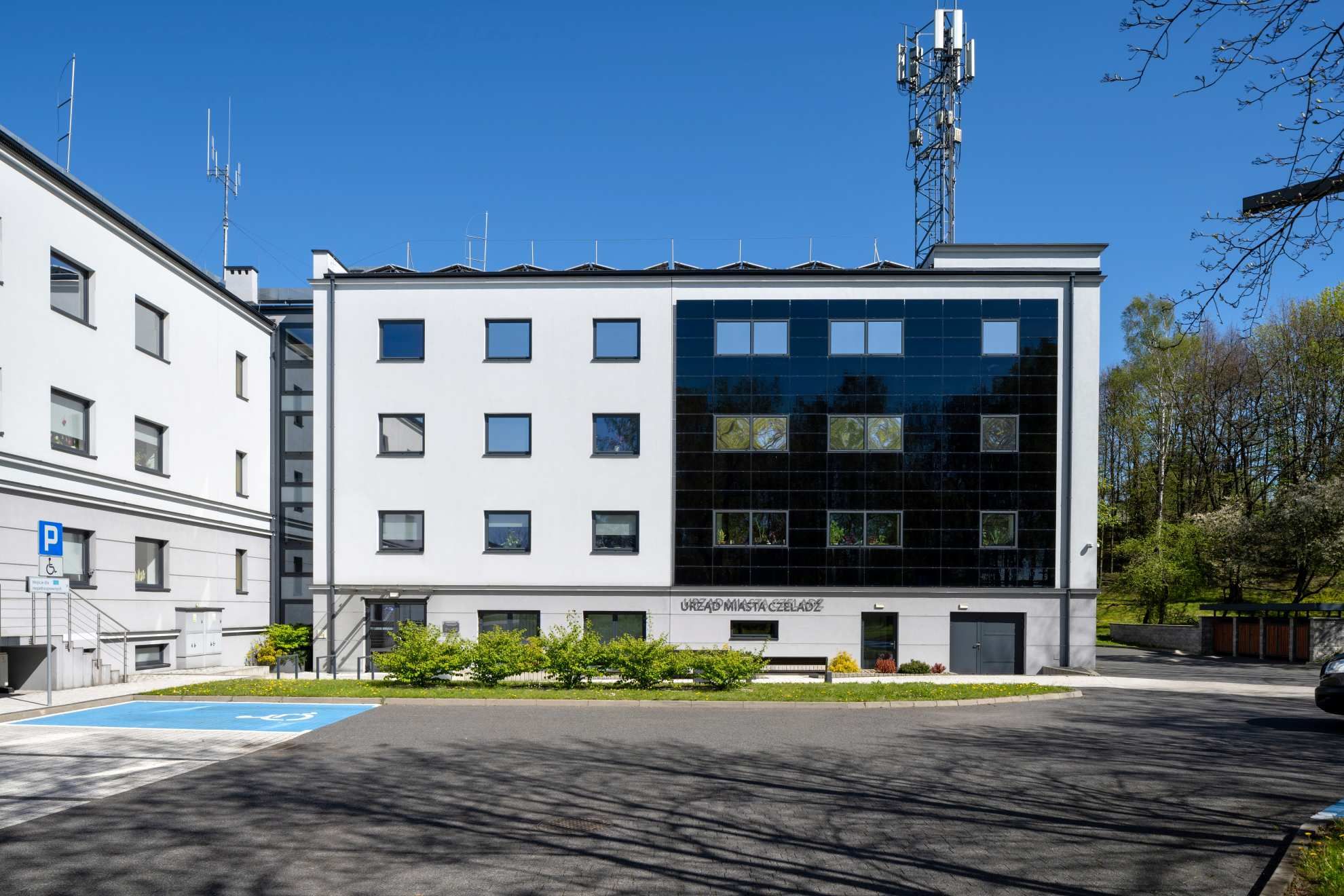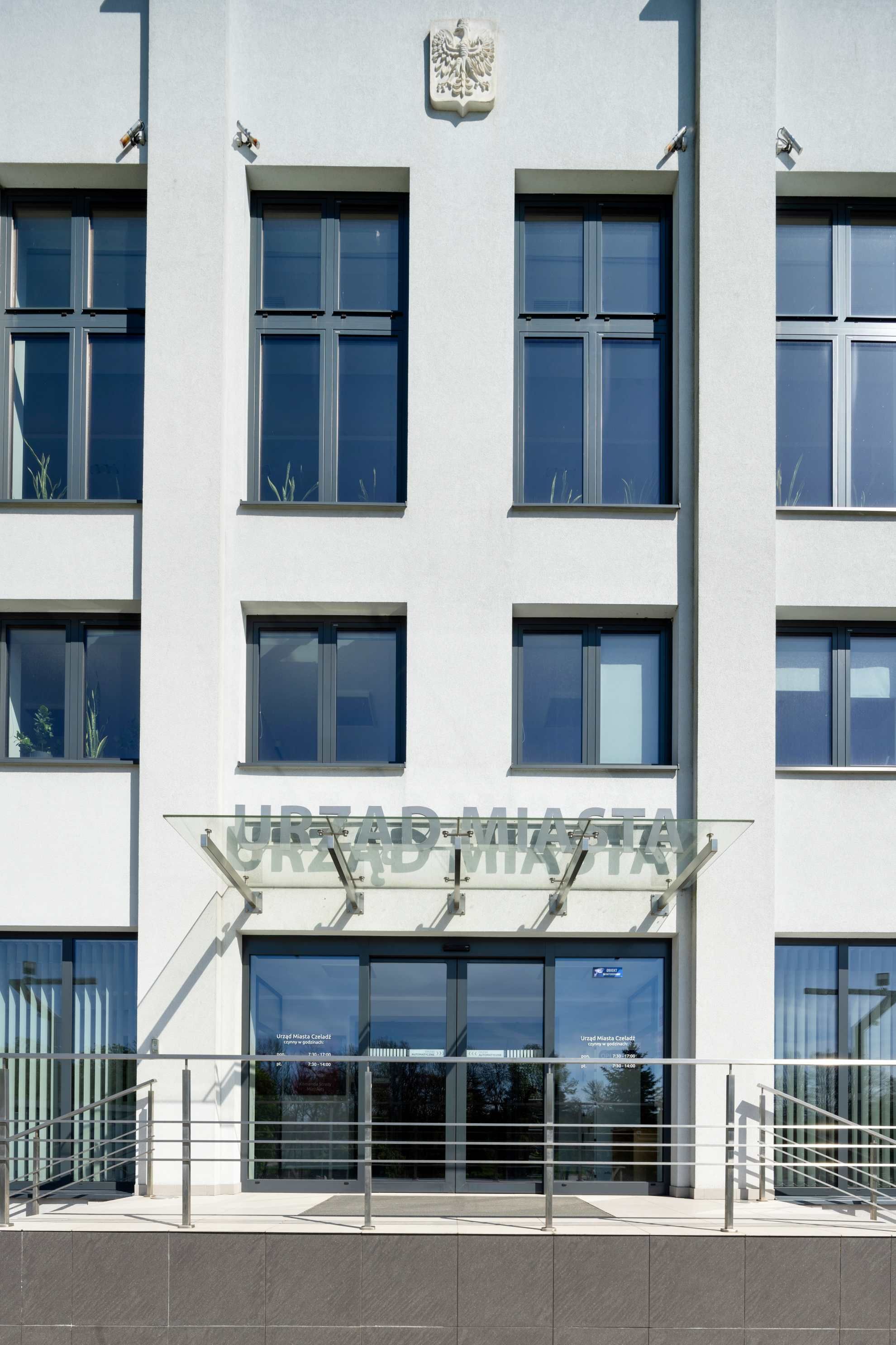 Bryła magistratu zachowała czytelny, symetryczny układ, charakterystyczny dla budynków administracji publicznej, jednak po modernizacji zyskała zupełnie nową jakość. Jasna elewacja, uporządkowane podziały i duże przeszklenia nadają obiektowi lekkości i współczesnego charakteru, jednocześnie wpisując go harmonijnie w historyczne otoczenie. Nowy wygląd budynku podkreśla jego reprezentacyjną funkcję, a starannie zaprojektowane wejścia, tarasy i zieleń tworzą przyjazną, otwartą przestrzeń dla mieszkańców.