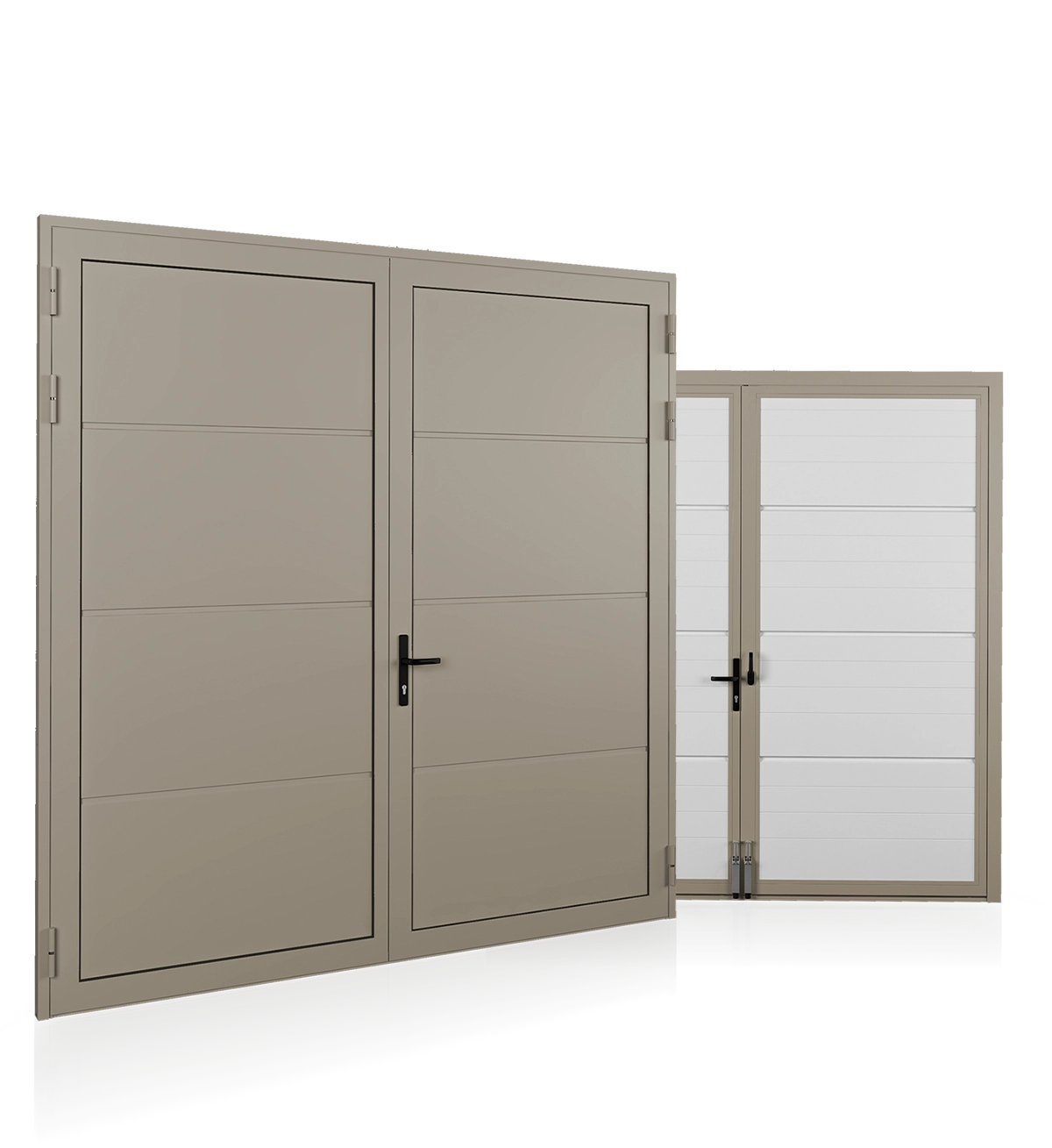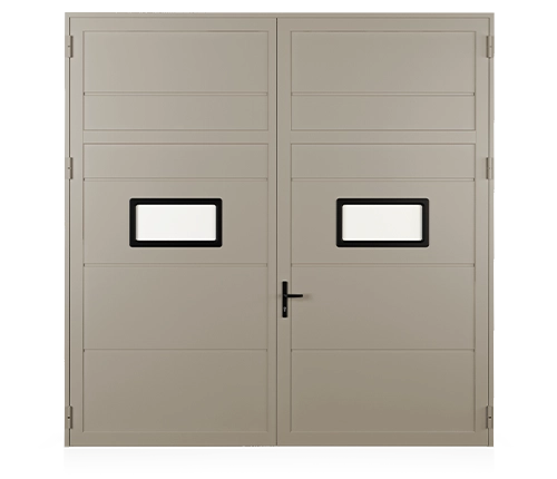Brama otwierana jest ręcznie, na zewnątrz. Standardowo wyposażona jest w ościeżnicę montowaną w otworze i dwa symetryczne skrzydła wypełnione panelem segmentowym 40 [mm].