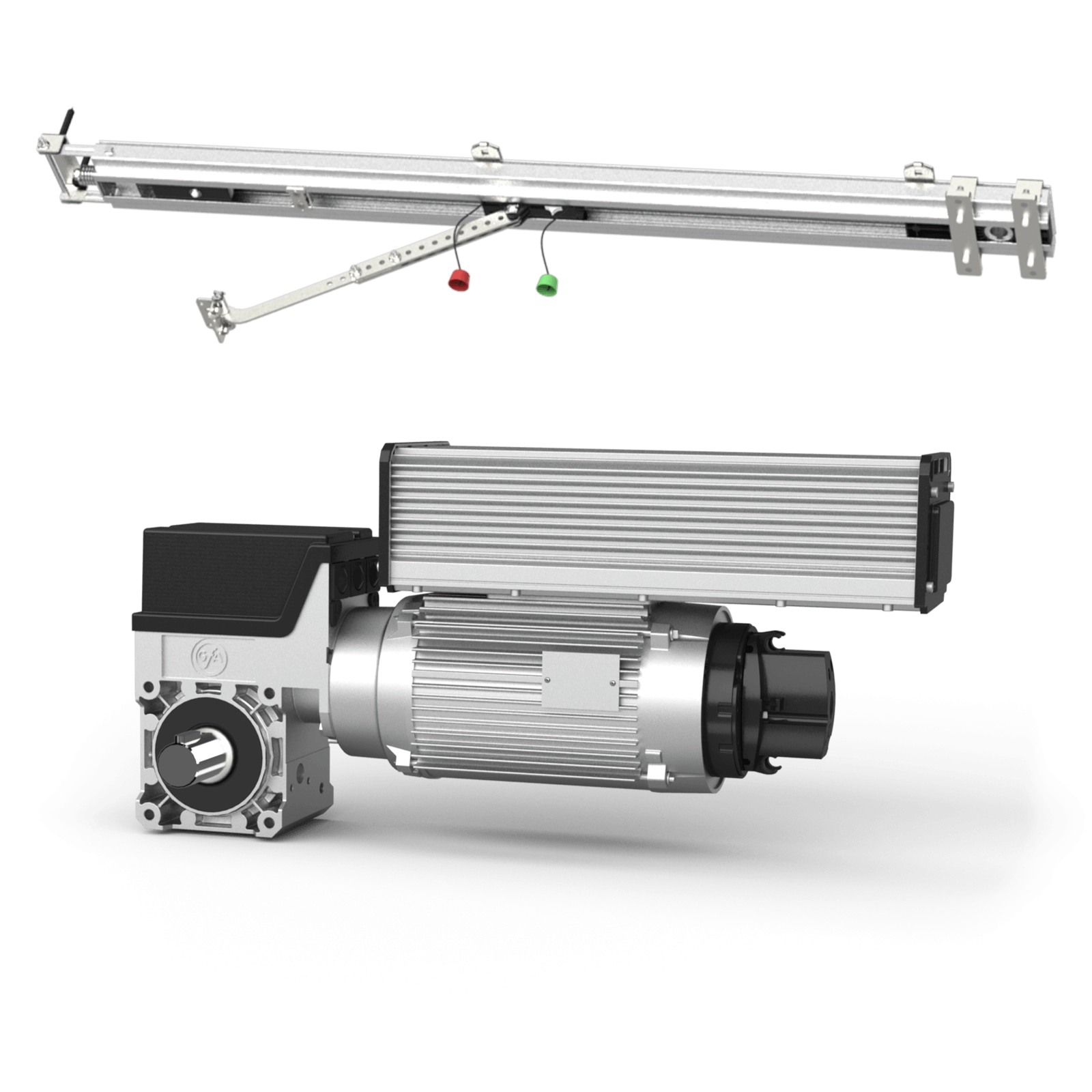 Napędy GfA serii SW to specjalne rozwiązania zaprojektowane do automatyzacji bram przemysłowych segmentowych z kompensacją masy. Montaż siłownika odbywa się szynie wyposażonej w łańcuch, a transmisja ruchu odbywa się za pomocą wózka jezdnego.